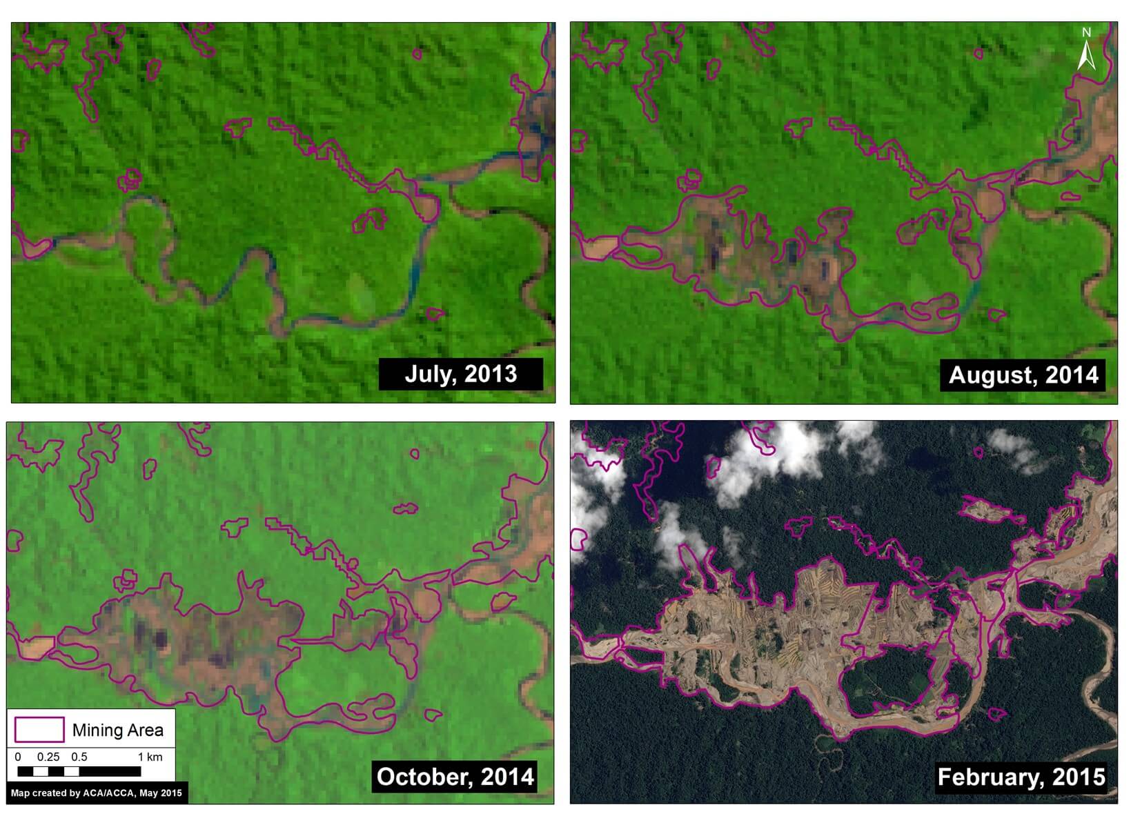 To better understand the deforestation dynamics over time along the Upper Malinowski, we created a satellite image (Landsat and SPOT 7) time-series. As seen in Image 5d, there was a rapid increase in mining deforestation in the less than two years between July 2013 and February 2015. Note that all four panels in Image 5d show the same location, but appear different because of the deforestation.