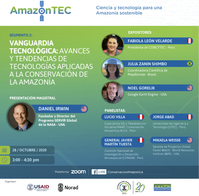 In the second of five sessions of the annual AmazonTEC event, titled Vanguardia Tecnológica: Avances y Tendencias de Tecnologías Aplicadas a la Conservación de la Amazonía, viewers learned about the latest advances in technology for conservation with specialists from NASA, CONCYTEC Peru, Google Earth Engine, and MAPBiomas. Click here to watch the recording of the second session (in Spanish).
