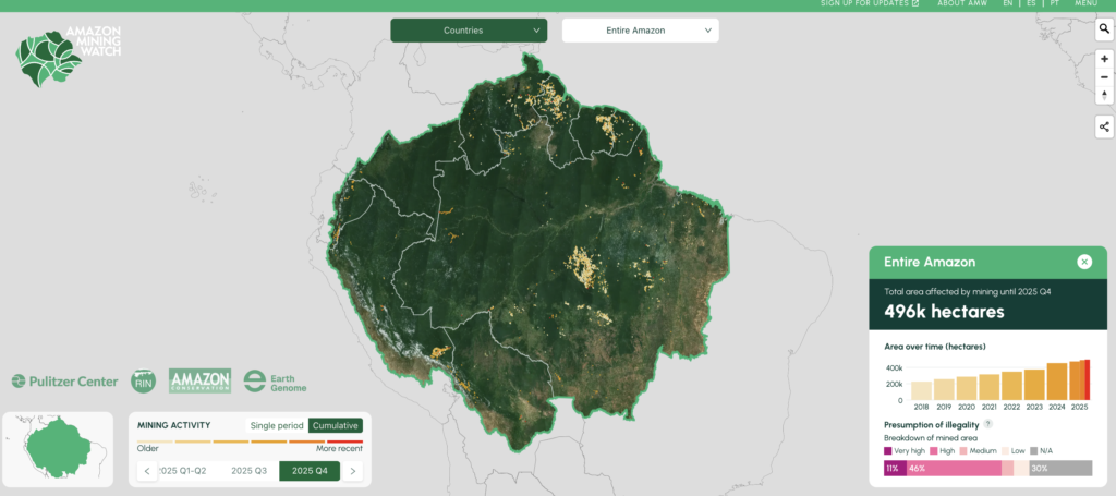 The recent launch of the Amazon Mining Watch’s Panorama reporting series marks a major step forward in making complex data more accessible and actionable. The inaugural report covering October through December 2025 revealed that in just these three months, approximately 6,000 hectares (14,000 acres) of forest were lost to gold mining across the Amazon, a stark reminder of the speed and scale of this growing threat. But data alone does not create change. Through our partnership with the Pulitzer Center, this information is being translated into stories that reach global audiences and bring local realities to international attention. By combining satellite-based monitoring with data-driven and investigative journalism, we are expanding public awareness of illegal mining as a transboundary issue that affects ecosystems, Indigenous territories, and communities across the entire Amazon Basin.